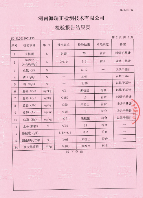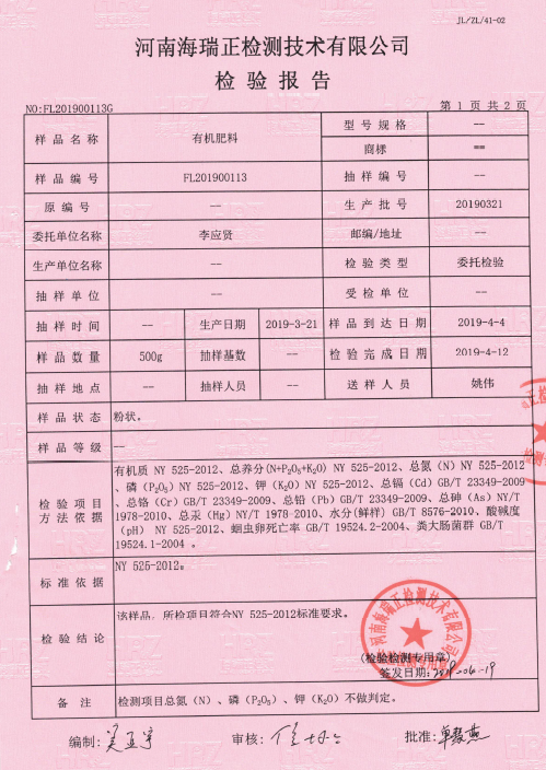 洛阳大统有机肥料检验报告出炉啰! 2021-07-16 肥料资讯 2019年4月4日 大统生技集团之洛阳大统所生产制造的有机肥, 通过河南海瑞正检测技术有限公司之检测! 检验报告如下, 其有机肥成份接府合标准规范!