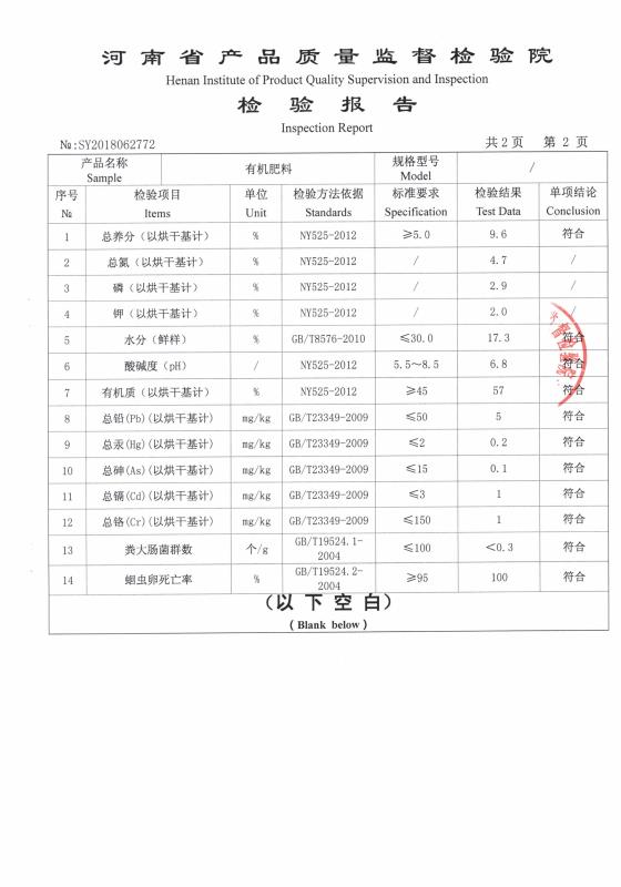 The results of the inspection by the Henan Institute of Quality Supervision and Inspection shows the nutrient content is extremely high. Total Nutrient 9.6, Total Nitrogen (N) 4.7, Organic matter 57, pH 6.8. Heavy metal content, fecal coliform, rate of died ascaris eggs all meets national requirements.